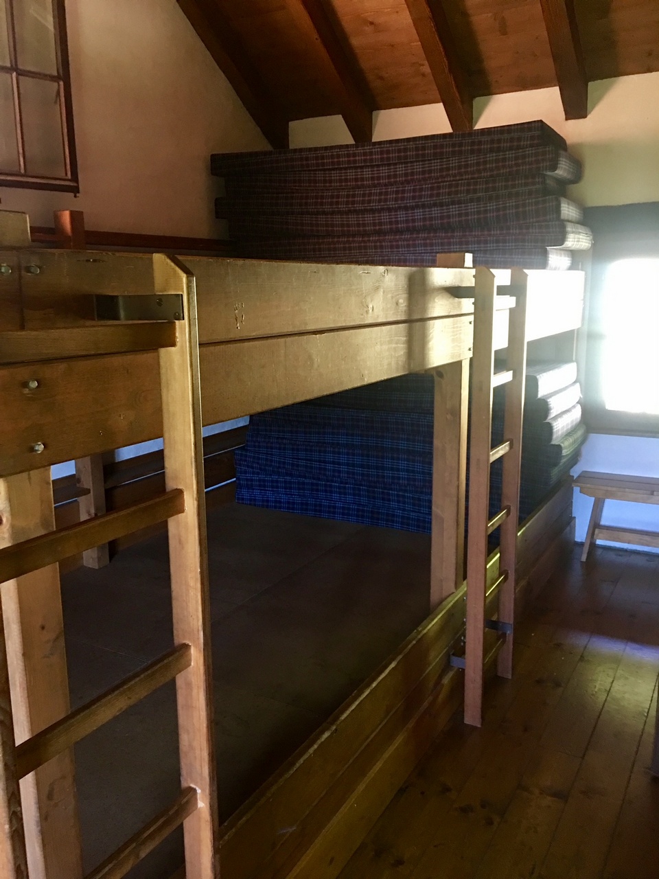 Accesso interno, 2 dormitori con 16 posti letto cadauno, a castello, 2 servizi WC con lavamani. Le doccie con 2 getti ad acqua calda e fredda con bollitore rapido e servizi toilette si trovano in un altro caseggiato.