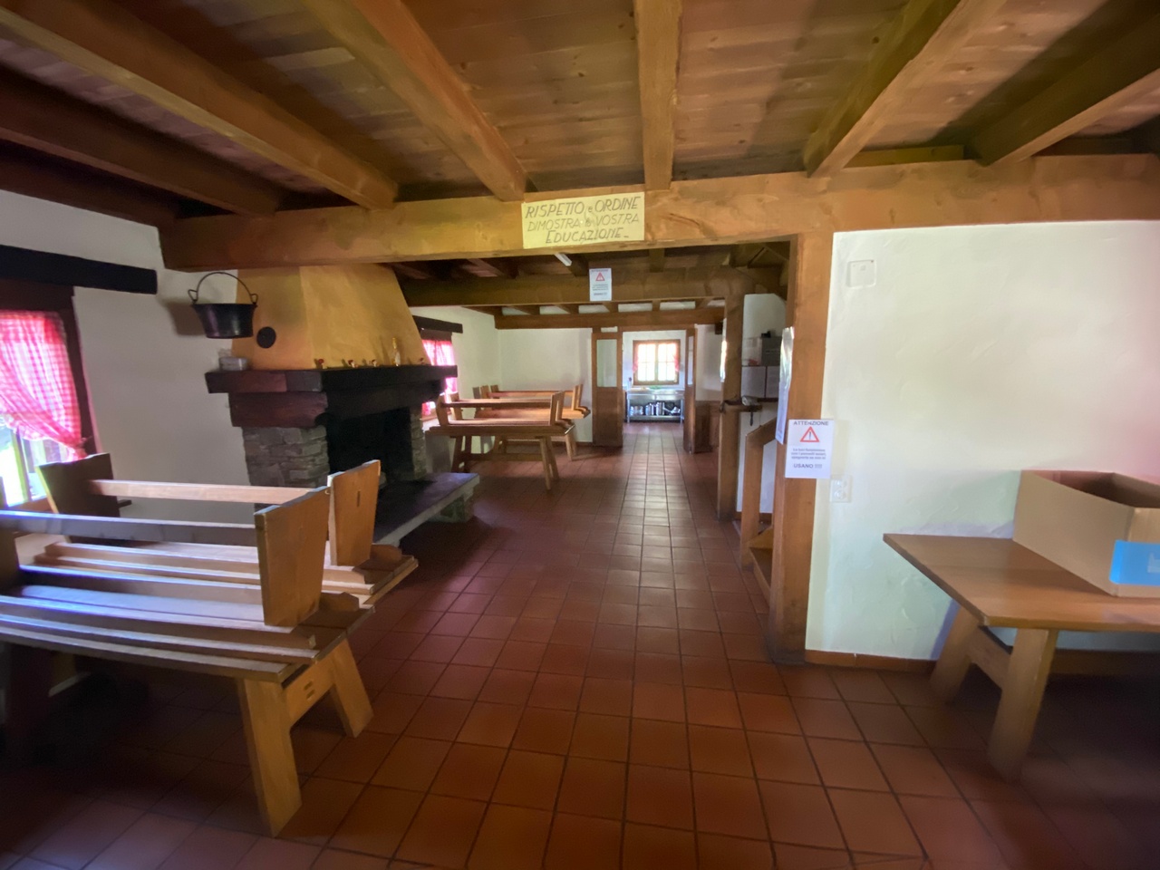 Tinello/mensa con grande camino, 8 tavoli con panchine. 1 WC con lavandino.